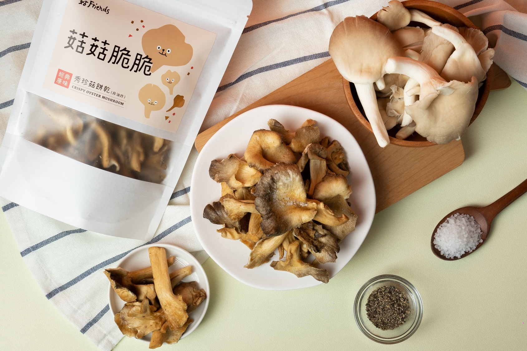 SHOP NOW菇 Friends 嚴選台灣種植的新鮮秀珍菇,透過多道乾燥程序、不過度複雜的調味,製作最簡單美好的家傳美味。菇菇脆脆口感爽脆,香菇的鮮味與香氣,無法抗拒的天然鹹香,咬下立馬在舌尖跳躍,一口接一口都是百分之百的秀珍菇製成,簡單美味的菇菇脆脆絕對是忙碌生活中的最佳休閒零嘴。